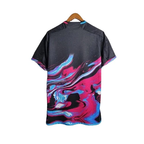 Celebrate greatness with the Argentina 2023 Commemorative Special Jersey—an electrifying tribute to La Albiceleste’s World Cup triumph. This limited-edition release fuses deep purples and jet black with explosive marbled streaks of pink and electric blue, capturing the energy and chaos of a nation’s footballing passion.