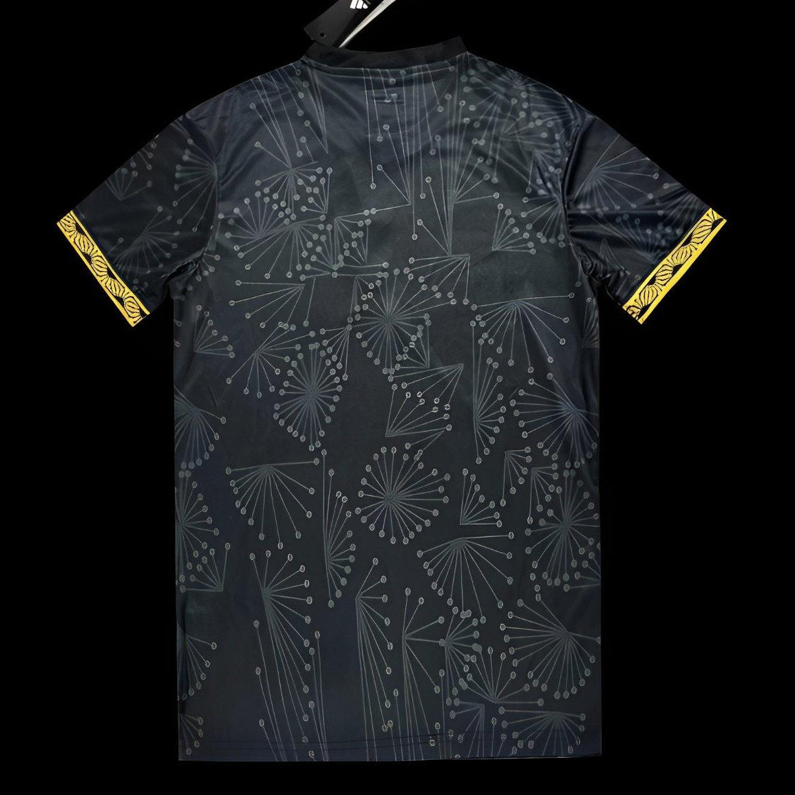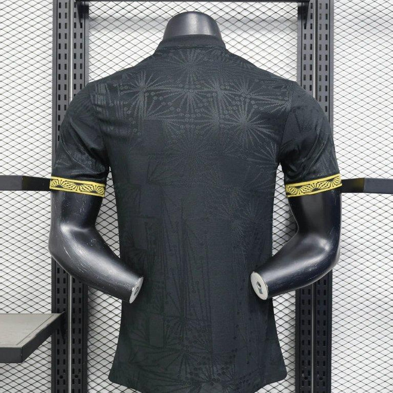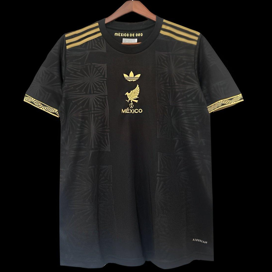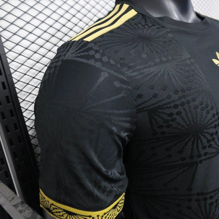 A striking special-edition Mexico National Team jersey was released for the 2025 Gold Cup. Finished in deep black with subtle tonal geometric patterns inspired by Mexican heritage, the kit is elevated with gold detailing throughout. Features the Adidas Originals trefoil, a gold Mexico crest, and premium trim on the sleeves and shoulders. Designed as a statement piece that blends match-day identity with lifestyle appeal, this jersey stands apart from standard home and away releases.