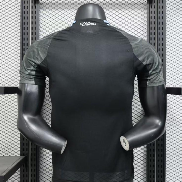 Aston Villa’s 25/26 away kit brings a sharp and modern edge to their iconic look. Designed in sleek black with silver-grey accents, it features a monochrome club crest and sky blue Adidas stripes on the shoulders for a clean, understated aesthetic.
