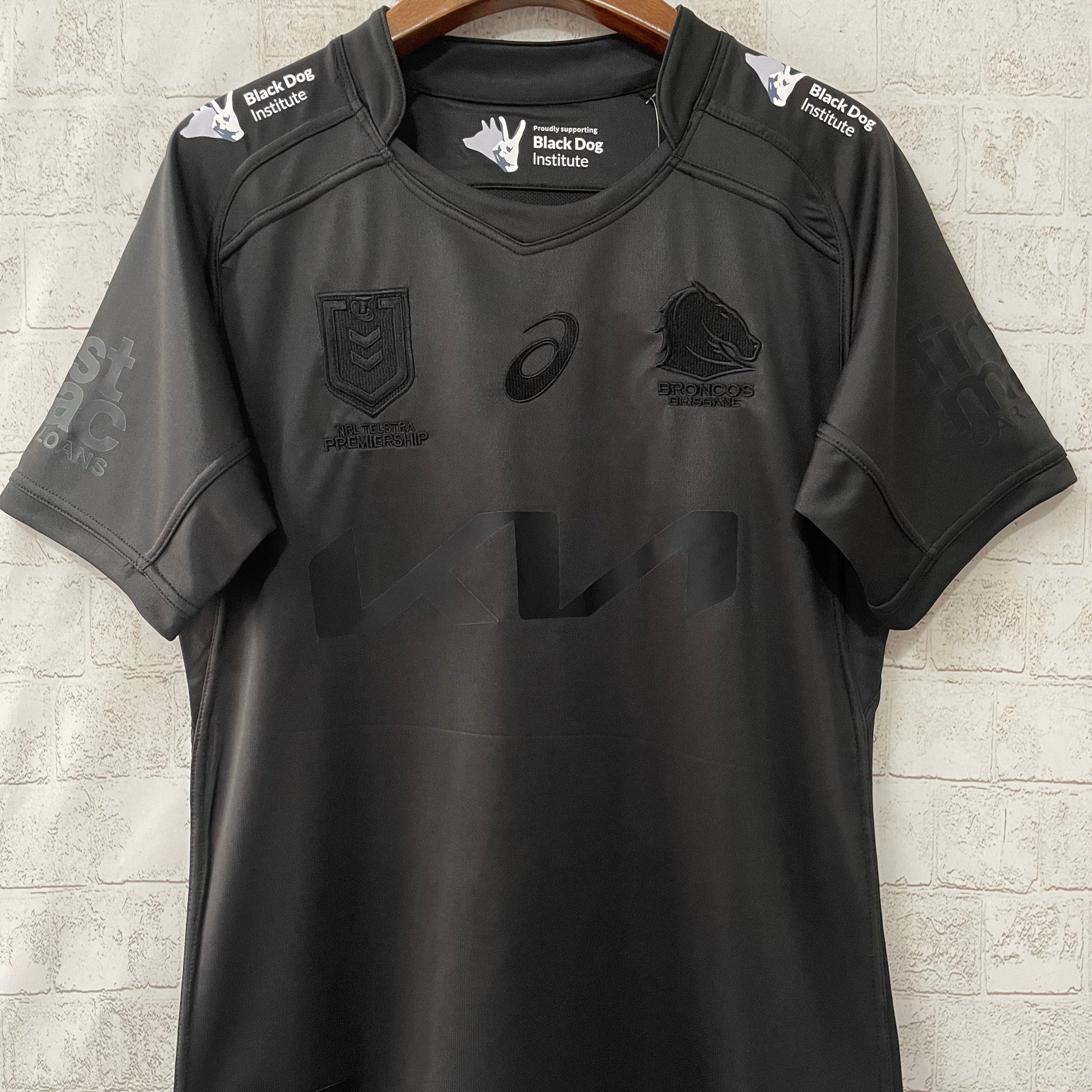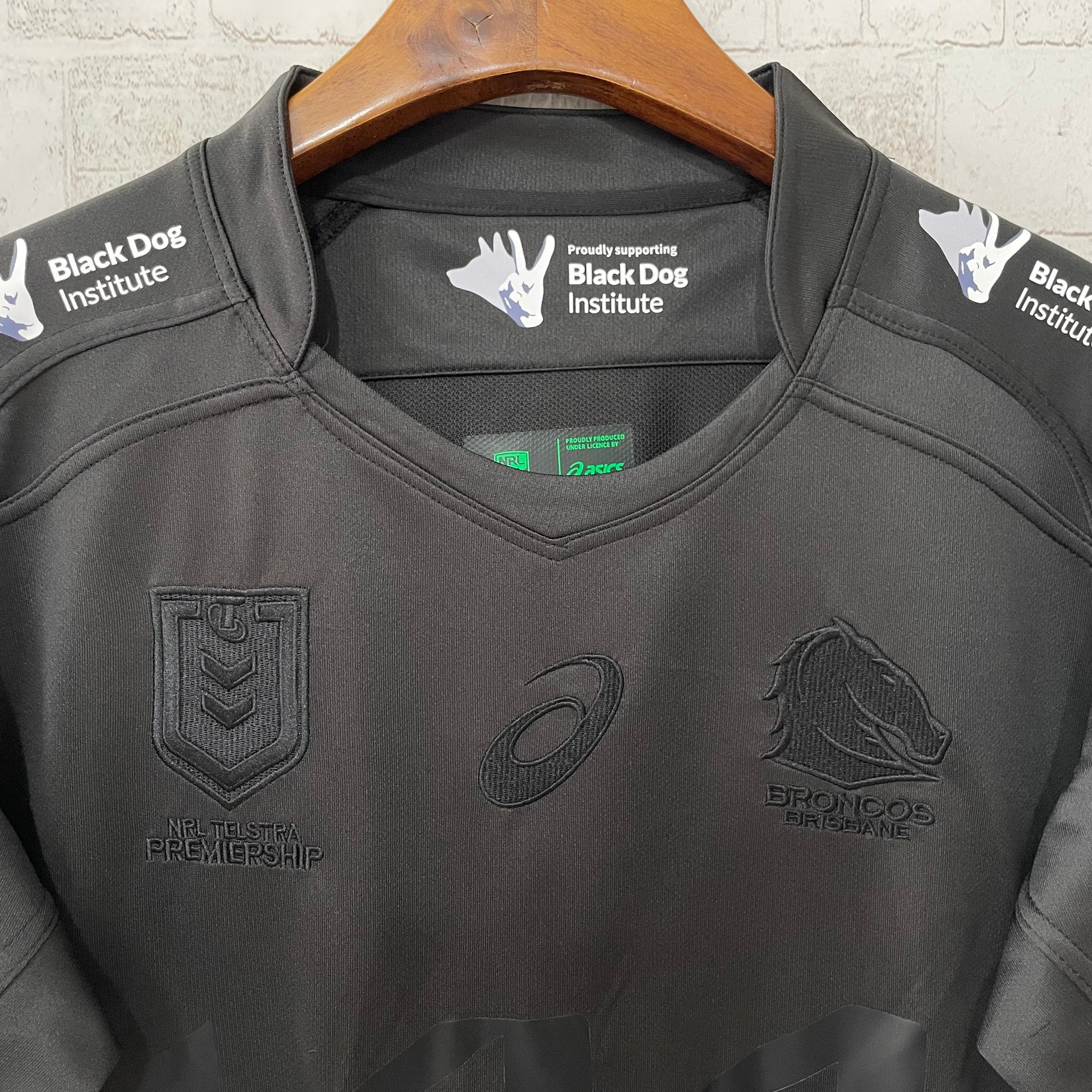 Worn proudly in support of the Black Dog Institute, this jersey blends sleek streetwear vibes with purpose. From the matte KIA sponsor to the shadowed Broncos crest, every detail is dipped in blackout heat.