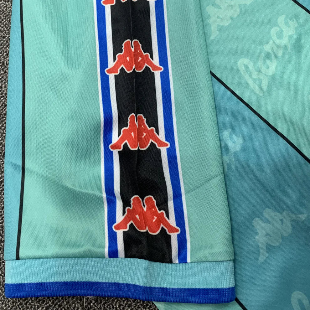 A true cult classic from the late 90s era of Barcelona kits. The 1996/97 away shirt stands out with its bold teal base, geometric panel design, and iconic Kappa branding running down the sleeves. Instantly recognisable and unapologetically retro.