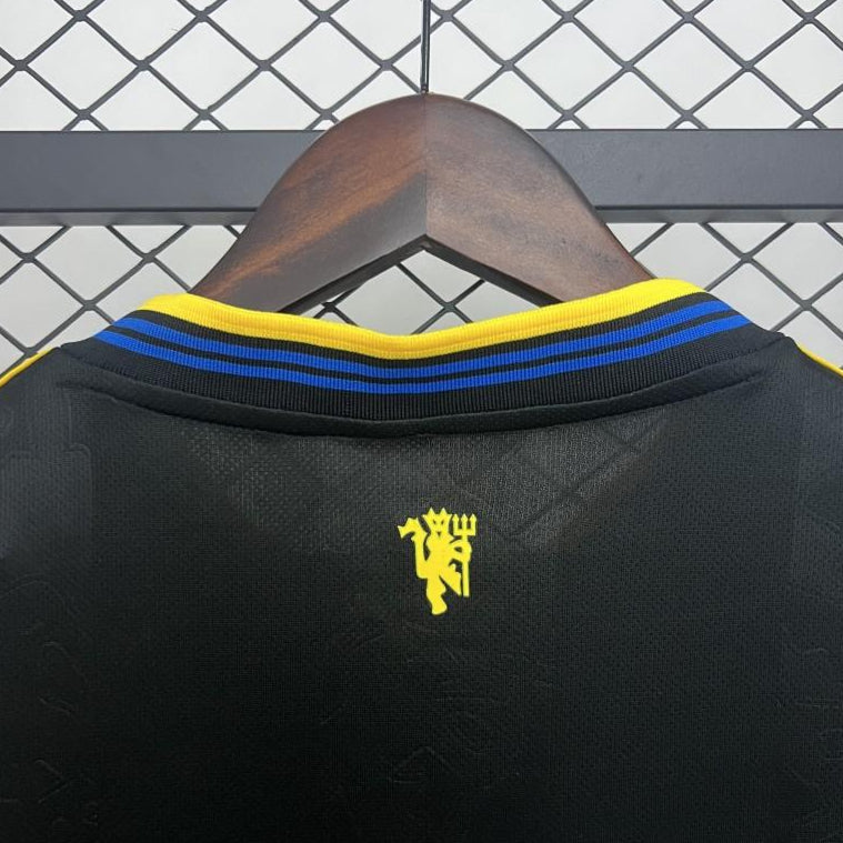 Stand out in United’s boldest look yet. The 2025/26 Third Kit reimagines the Red Devils in blacked-out style with sharp contrast yellow detailing and blue trims. Featuring a retro-inspired Trefoil logo and the iconic Snapdragon sponsor, this jersey blends heritage and modern energy.
