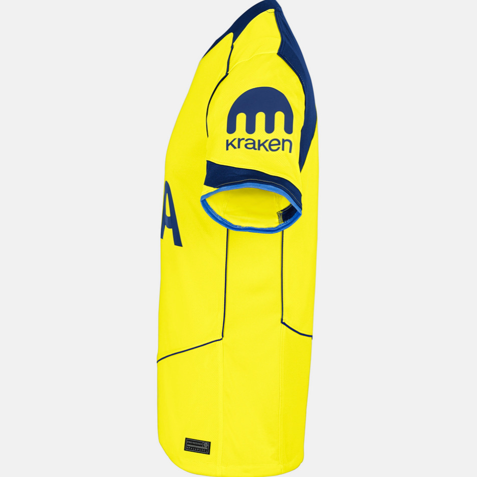 Tottenham’s 25/26 third kit is a bold throwback with modern flair. Drenched in a vibrant canary yellow, this design pays tribute to Spurs’ 1990s classics while introducing fresh detailing. The retro crest sits proudly beneath the collar, honouring club heritage, while the navy blue accents cut sharply across the sleeves and collar. AIA returns as the front sponsor, and the geometric lower-panel stitching gives the kit a futuristic edge. Whether you're a vintage purist or a new-gen fan, this kit connects eras — and commands attention.