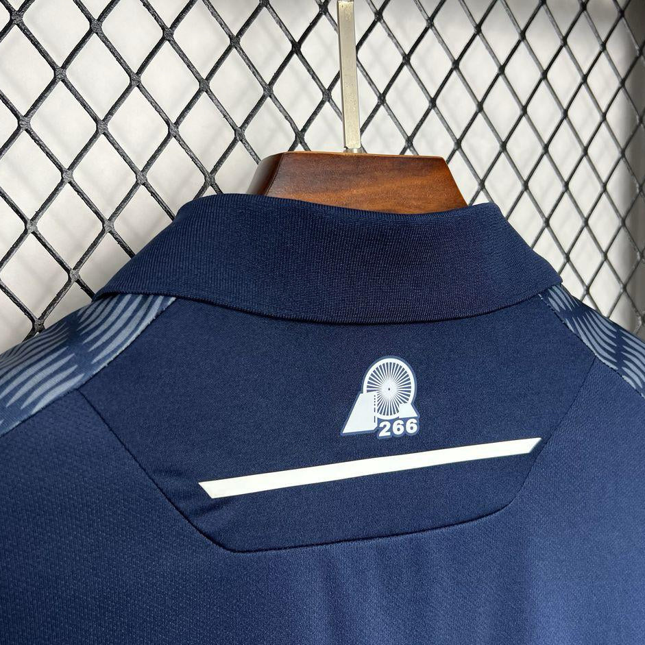 Stand out with this striking Wrexham AFC 24/25 away kit, featuring a deep navy base layered with a bold geometric pattern inspired by Welsh heritage. With crisp white trims and a smart buttoned collar, the design blends classic football style with modern detail.